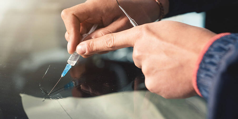 飛び石などで傷付いたガラスの修理には、ひび割れの中に入ってしまった空気を抜き、レジンを入れる作業を行います。
